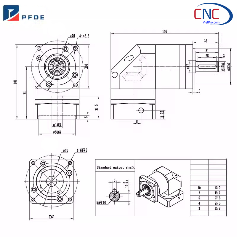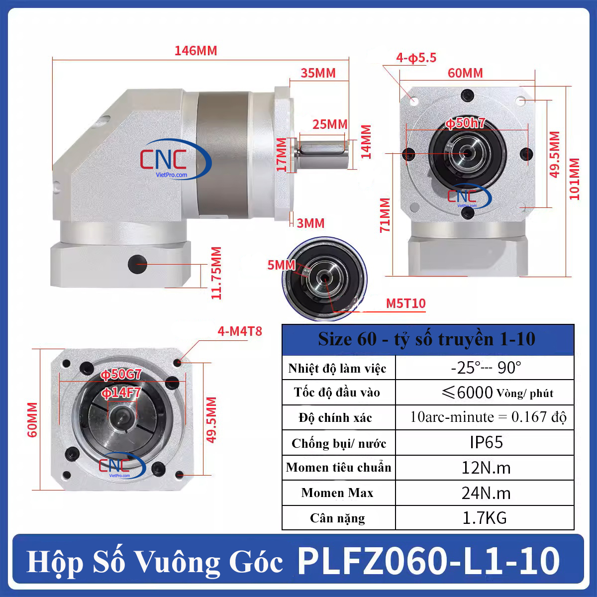 Hộp số vuông góc Servo Size 60 (PLFZ060) là dòng hộp giảm tốc hành tinh vuông góc chuyên dùng cho động cơ servo 400W – 600W trong các hệ thống máy CNC, robot, máy đóng gói, máy khắc, máy cắt, băng tải tự động.